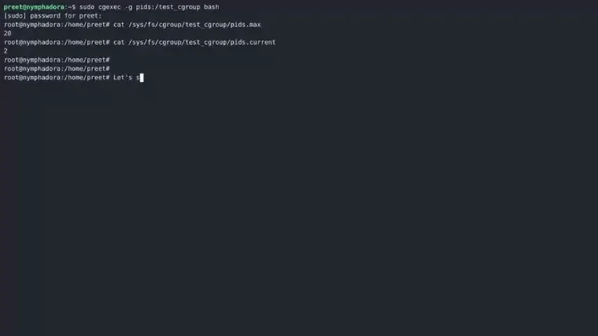 preet@nymphadora:~/# sudo cgexec -g pids:/test_cgroup bash